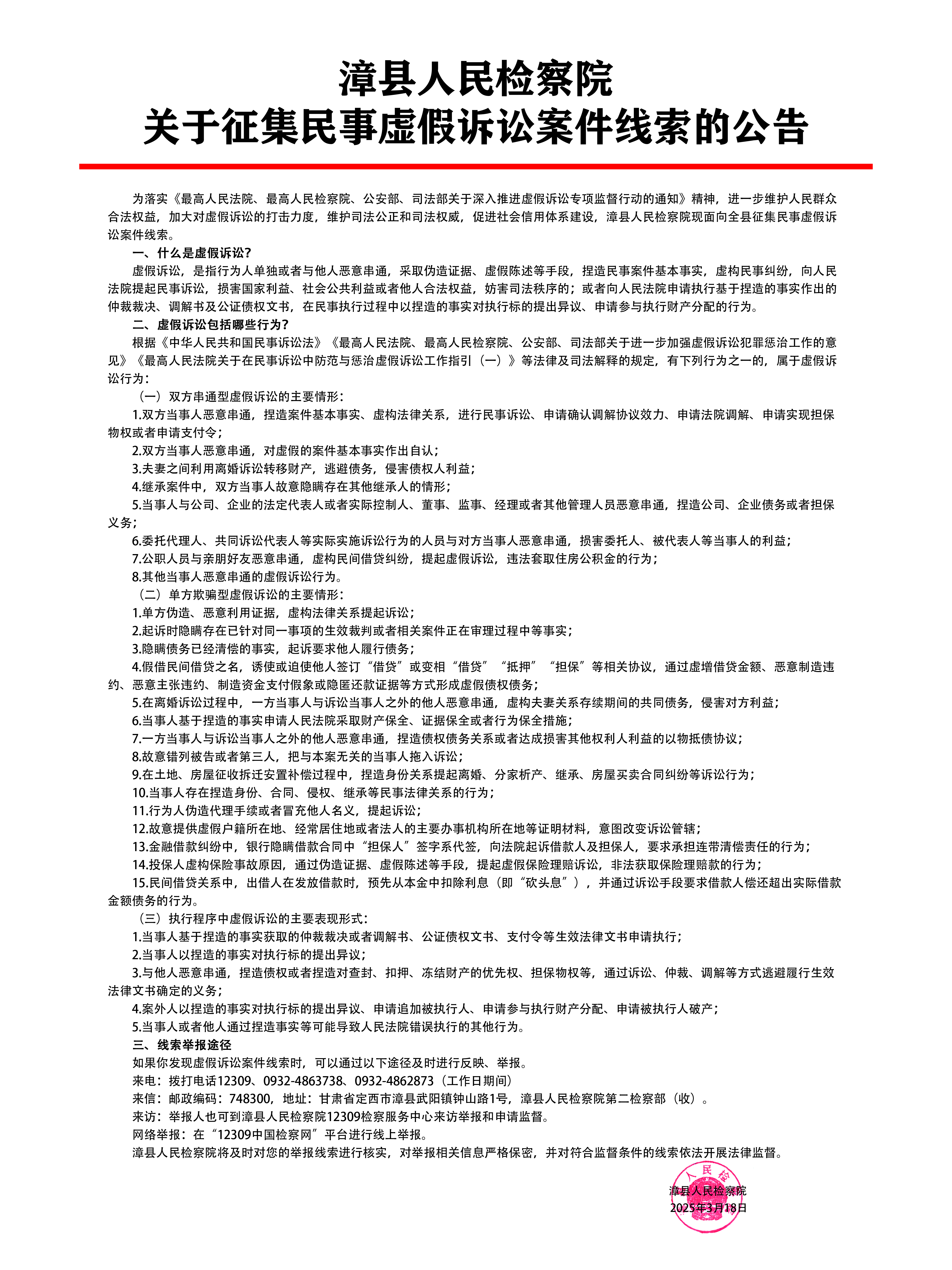 • 漳縣人民檢察院關(guān)于征集民事虛假訴訟案件線索的公告